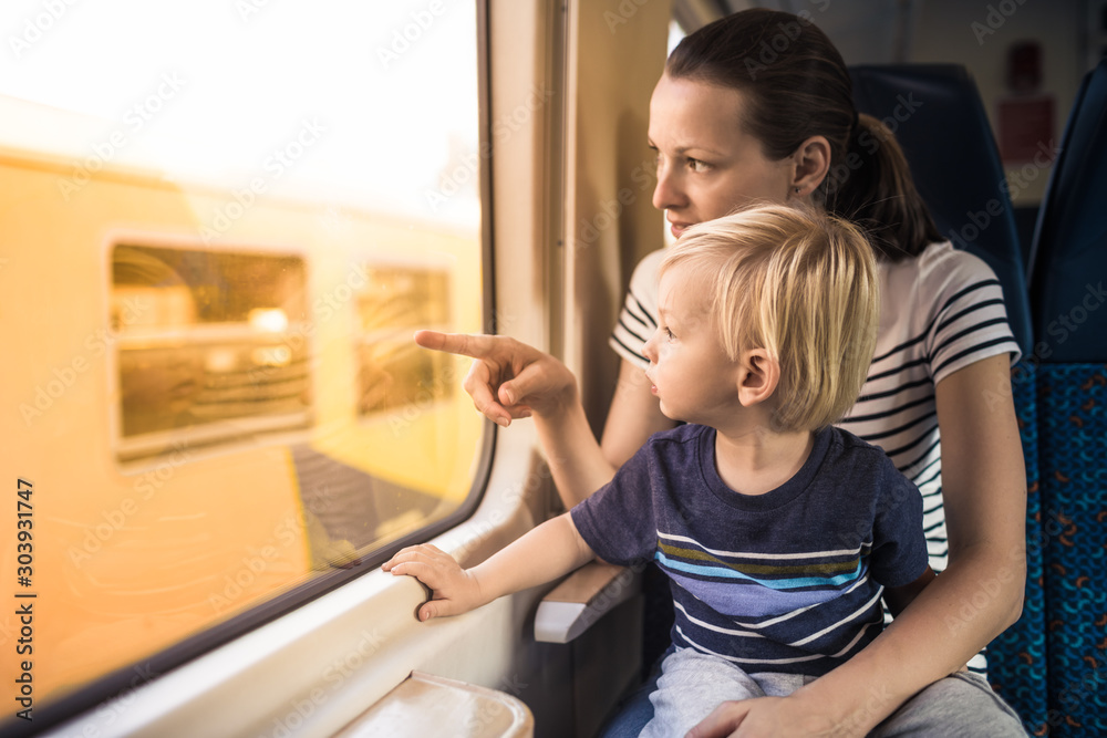 Mother and child riding on train together. Parenting and teaching your kids concept.