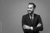 Smiling young business man in classic black suit shirt tie posing isolated on grey background. Achievement career wealth business concept. Mock up copy space. Holding hands crossed, looking aside.