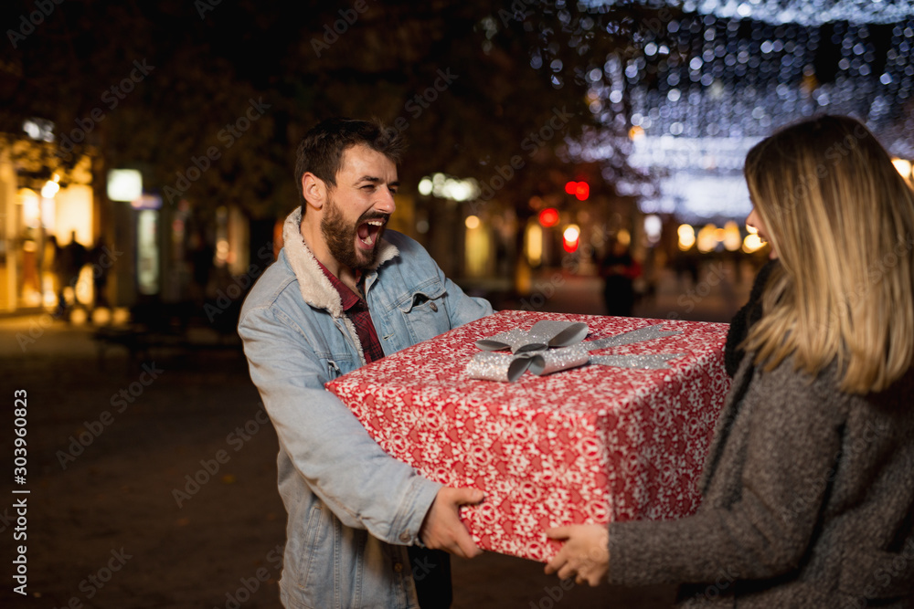 Christmas gift, happy couple with Christmas and New Year gift on street