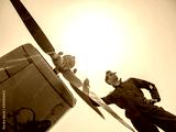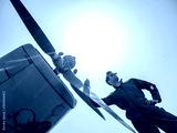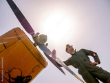 A handsome young pilot standing next to the propeller