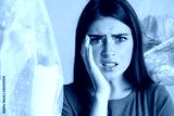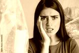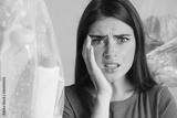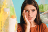 Close up girl with eco bags with plastic waste around sadly looking in camera over colorful background isolated