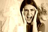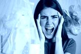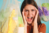 Close up annoyed girl with eco bags with plastic waste around looking in camera screaming over colorful background