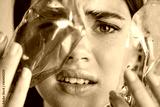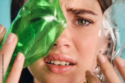Close up girl covering face with empty plastic bottles while sadly looking in camera over colorful background