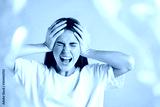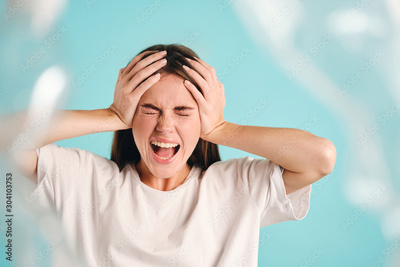 Irritated girl closing eyes while angrily screaming on plastic over colorful background