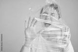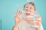 Afraid emotional girl scaredly screaming choking in plastic bag over colorful background isolated