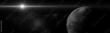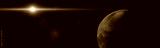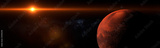 Sunrise over the planet mars in space with strong flare and shadows panoramic