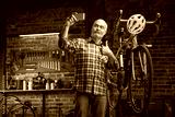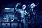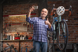 Mechanic or rider giving a thumbs up in a workshop as he takes a selfie after he finishes working on a bicycle mounted on a stand for servicing or repair