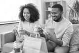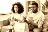 eating and people concept - happy african american couple with takeaway food and drinks at home