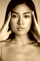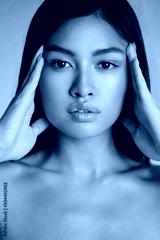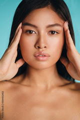 Close up of beautiful stylish Asian brunette girl confidently looking in camera over colorful background isolated