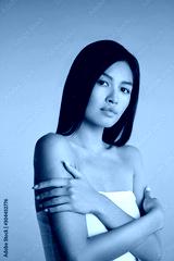 Attractive tender Asian brunette girl intently looking in camera over colorful background isolated
