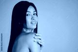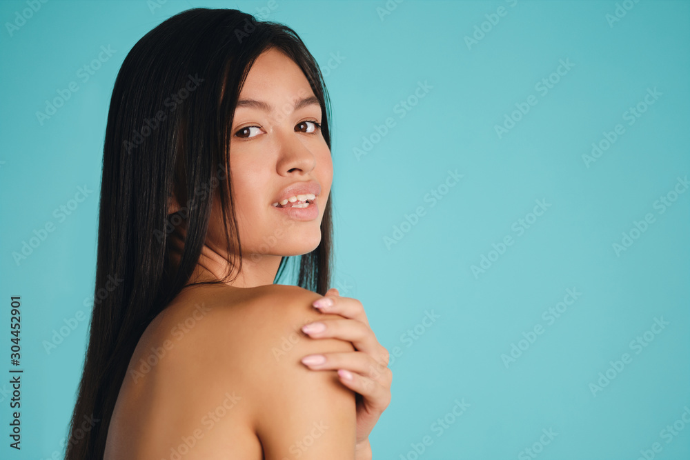 Beautiful Asian brunette girl happily looking in camera over colorful background isolated