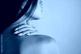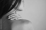 Close up back view of tender Asian brunette girl sensually posing over colorful background isolated
