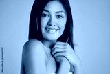 Pretty smiling Asian brunette girl joyfully looking in camera over colorful background isolated