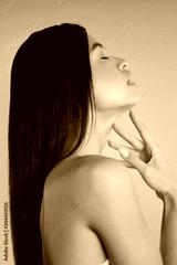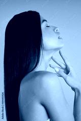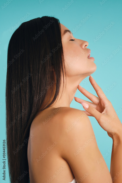 Side view of gorgeous sexy Asian girl with dark long hair sensually posing over colorful background isolated