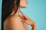 Close up side view of sexy Asian brunette girl sensually posing over colorful background isolated