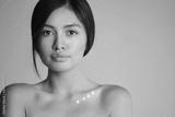 Beautiful Asian brunette girl with points of cream on clavicle intently looking in camera over colorful background isolated