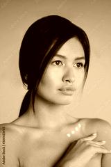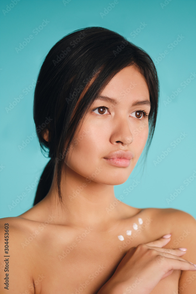 Attractive Asian brunette girl with points of cream on clavicle thoughtfully looking away over colorful background isolated