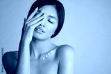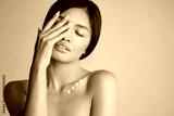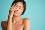 Close up sexy Asian brunette girl with points of cream on clavicle sensually posing over colorful background isolated