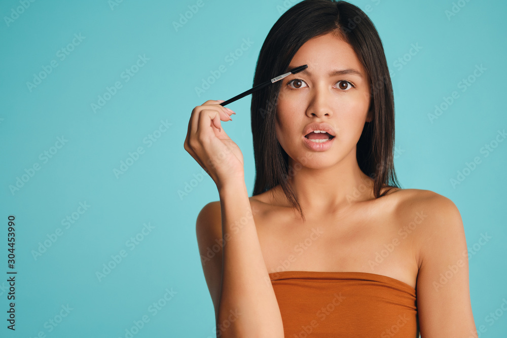 Shocked Asian brunette girl with cosmetic brush applying eyebrow gel amazedly looking in camera over colorful background isolated