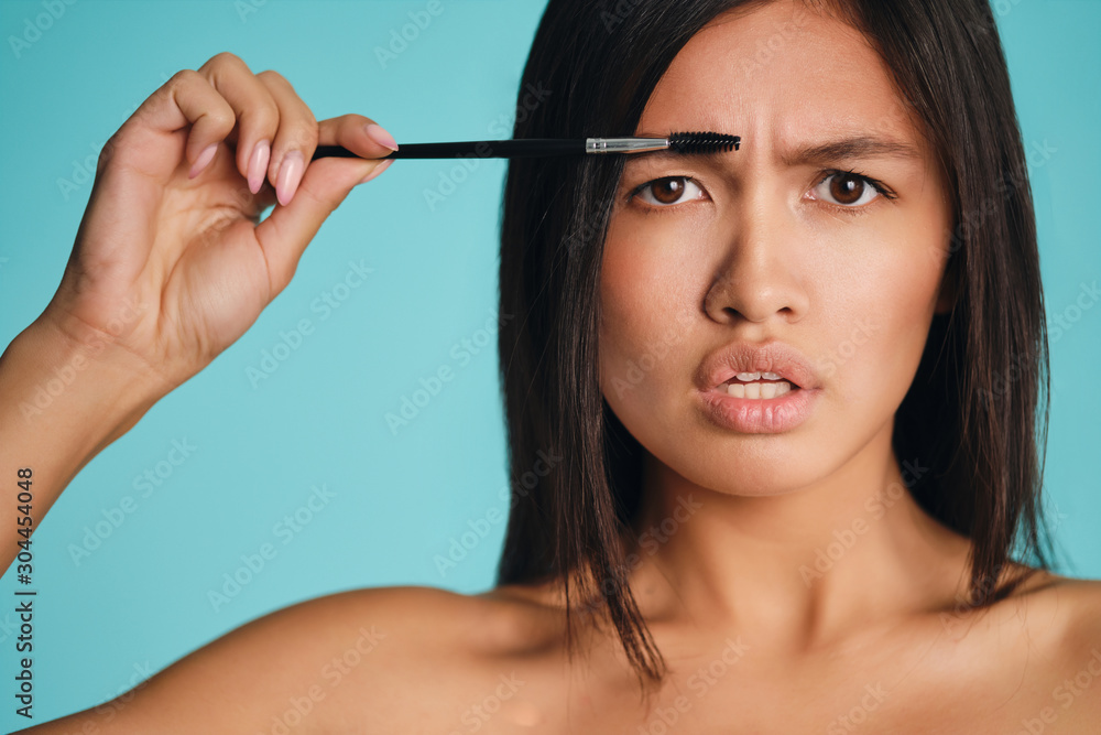 Close up serious Asian brunette girl with cosmetic brush applying eyebrow gel angrily looking in camera over colorful background isolated