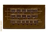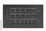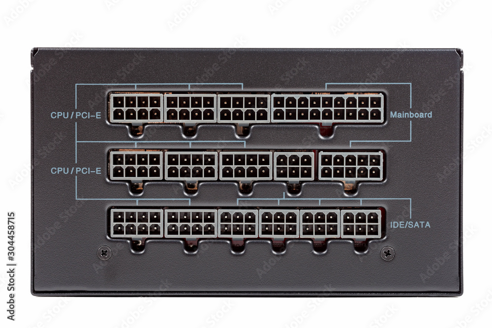 Modern new pc modular power supply unit front side, 8 pin and 6 pin cpu pci-e, ide sata and mainboard unplugged empty connectors, convenient module psu back plate with no cables attached, isolated