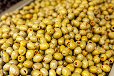A heap of big fresh Italian ripe green olives with paprika filling. Traditional local food market / bazaar wet olive stack closeup, background texture, nobody, mediterranean food concept