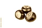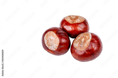 Three brown chestnuts, fresh clean autumn conkers isolated on white background, closeup. Collecting chestnuts for health care purposes concept