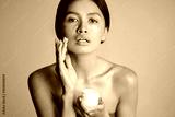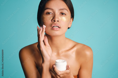 Beautiful Asian brunette girl with patches under eyes applying cream on clean skin over colorful background isolated