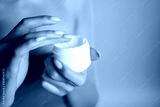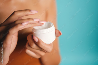 Close up woman hands holding jar of beauty cream over blue background isolated