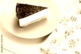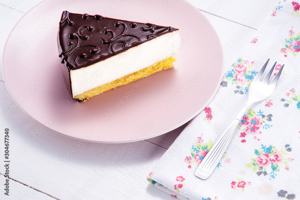 Chocolate cake with decoration and fruits on wooden background