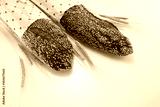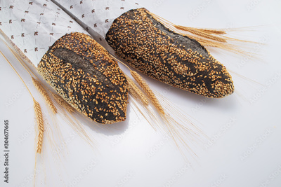 Homemade sourdough bread baguette in packet and wheat isolated on white background