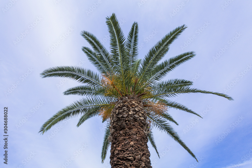 Leaves of green palm tree isolated on blue sky background. Horizontal color photography.