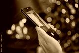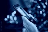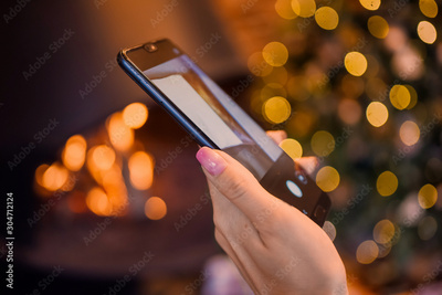 female hand with manicure holding a smartphone and taking a photo of fire in the fireplace with the background of a Christmas tree in the lights