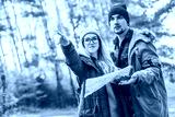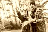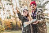 Travel couple with map, compass and backpack in the forest. Freedom and active travel concept.