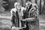Travel couple with map, compass and backpack in the forest. Freedom and active travel concept.