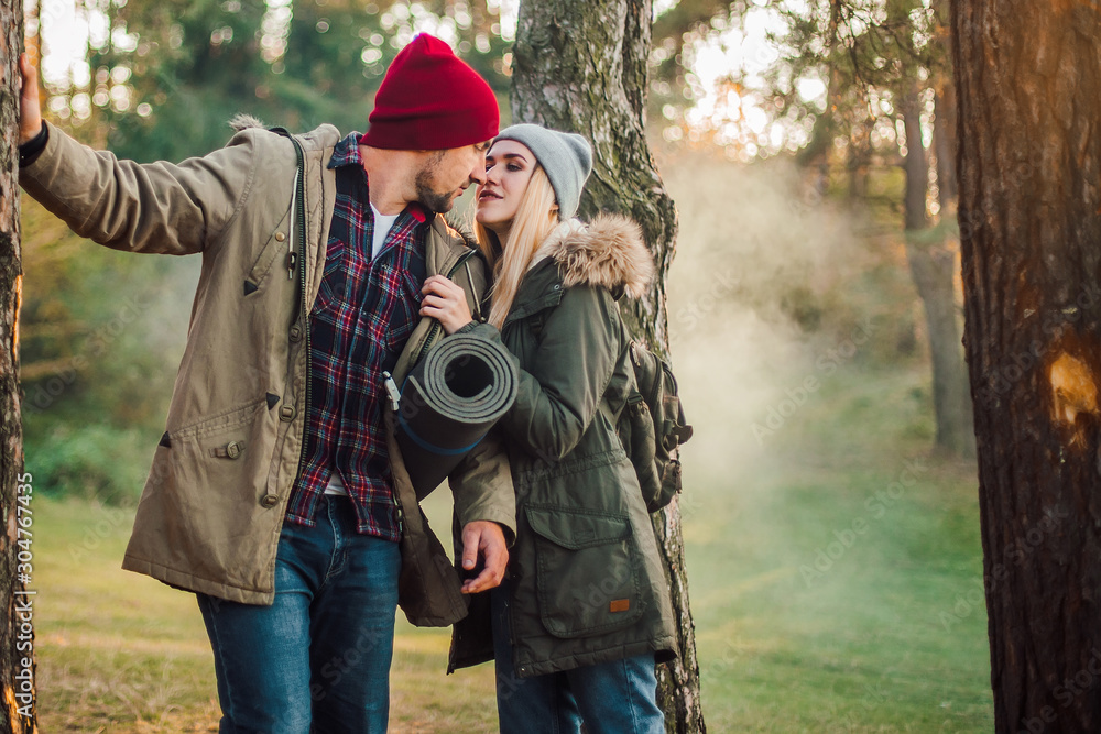 Hiking couple with backpack walking in the forest and exploring outdoors. Freedom and active travel concept.