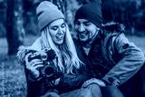 Travel couple camping with camera having fun in the forest. Concept of trekking, adventure and seasonal vacation.