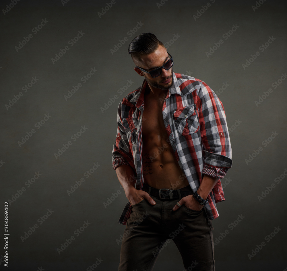 Handsome Male Model With Sunglasses Wearing Unbuttoned Shirt Exposing His Muscular Torso