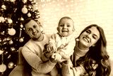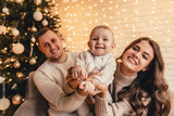Happy family of mother, father and little baby boy hugging and celebrating new year in front of Christmas tree in decorated interior. Celebrating Christmas.