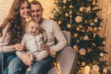 Happy family of mother, father and little baby boy hugging and celebrating new year in front of Christmas tree in decorated interior. Celebrating Christmas.