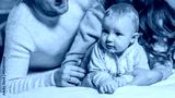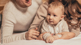 Happy family lie on the bed in decorated interior. Celebrating Christmas.