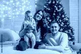 Happy family of mother, father and little baby boy hugging and celebrating new year in front of Christmas tree in decorated interior. Celebrating Christmas.