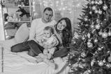 Happy family sitting on bed and celebrating new year near Christmas tree in decorated interior. Celebrating Christmas.