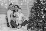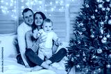 Happy family sitting on bed and celebrating new year near Christmas tree in decorated interior. Celebrating Christmas.
