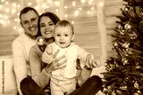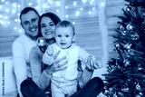 Happy family sitting on bed and celebrating new year near Christmas tree in decorated interior. Celebrating Christmas.