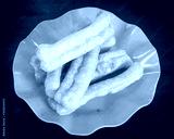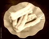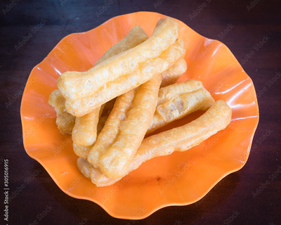 Youtiao or Asian doughnut in orange plate on wooden table close-up