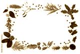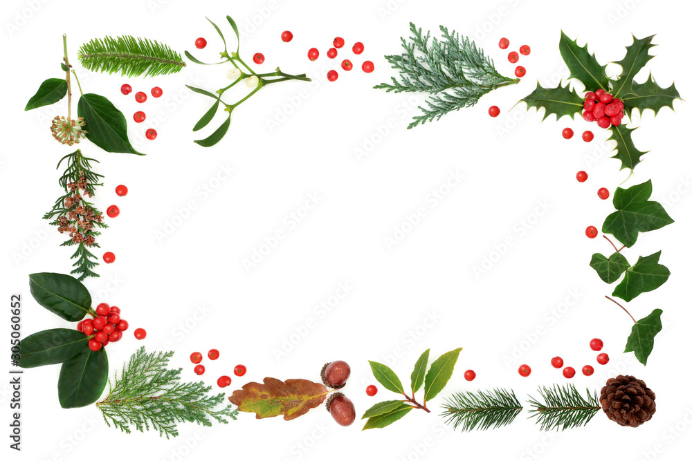 Winter flora & fauna with loose holly berries forming an abstract border on white background with copy space. Traditional natural greenery for the festive Christmas season & New Year.