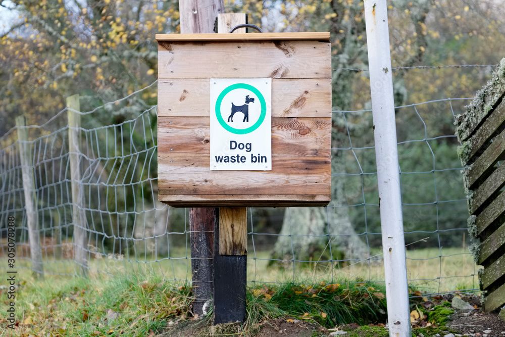 Wooden dog poo box bin on post in rural location to keep the countryside clean and litter free