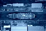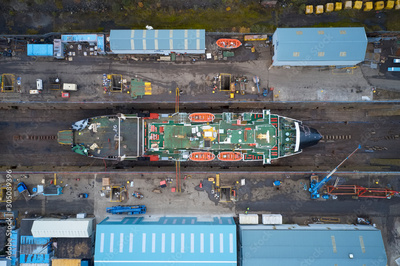 Dry dock and ship with shipbuilding in construction activity aerial view from above Greenock UK