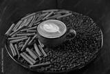 cup of coffee with beans and cinnamon sticks
